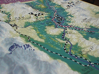 北アルプスの山の連なりまでも表現した、立体地図の一例です。